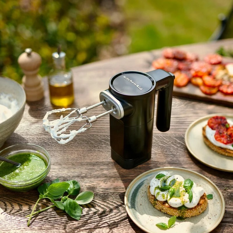 Kompaktný bezdrôtový ručný šľahač modernej konštrukcie – ľahká manipulácia umožňuje univerzálne použitie a pohodlnú prácu bez kábla. V elegantnej matnej čiernej farbe, súčasť novej kolekcie bezdrôtových spotrebičov KitchenAid Cordless GO, ucelenej rady prístroja na dovolenku a cesty. Chod prístroja zabezpečuje 12V lithium-iontová dobíjacia batéria. V sade je telo prístroja, nerezové turbo šľahacie metličky, nabíjací USB kábel a batéria. Funkcia mäkký štart zabraňuje rozstreku, šľahač vďaka 7 rýchlostiam a rýchlosti 1 100 otáčok za minútu zaručuje rýchle a starostlivé premiešanie, trenie či vyšľahanie prísad.